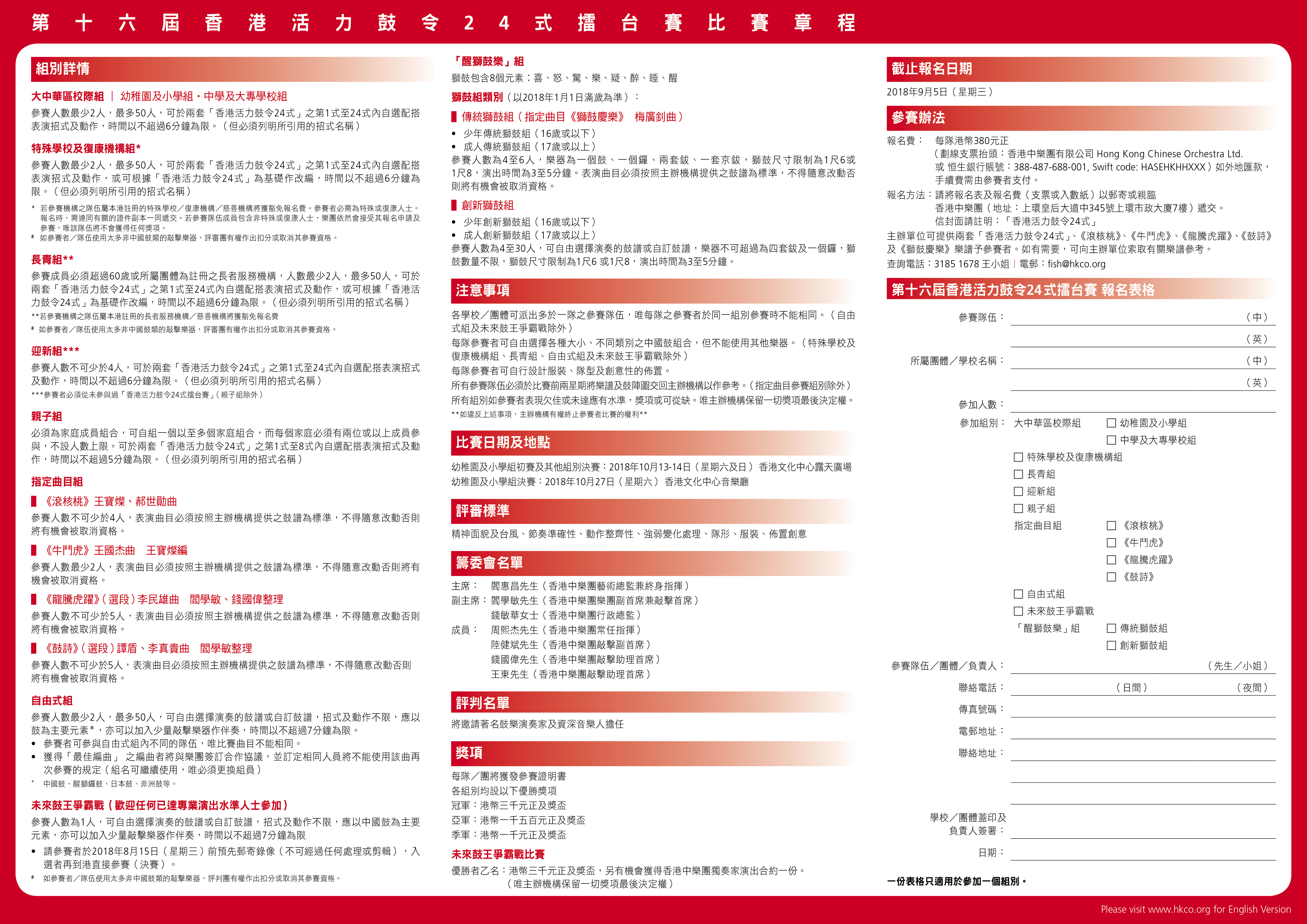 * 若參賽機構之隊伍屬本港註冊的特殊學校/復康機構/慈善機構將獲豁免報名費。參賽者必需為特殊或復康人士。 報名時,需連同有關的證件副本一同遞交。若參賽隊伍成員包含非特殊或復康人士,樂團依然會接受其報名申請及參賽,唯該隊伍將不會獲得任何獎項。